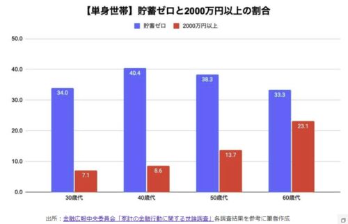 LIMOから30歳代~60歳代「貯蓄ゼロ・貯蓄2000万円以上」の割合を棒グラフで比較してみたなる記事がでていました。 まずは、世帯別・年代別平均貯蓄額。 ※画像にある『筆者作成』は『スパコンSE作成』じゃないよ! 予想通り、おしなべて二人以上世帯の方が貯…