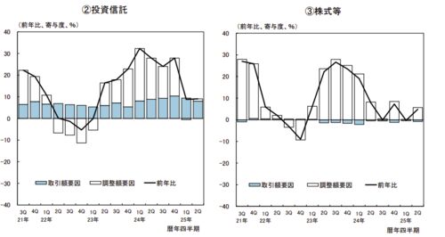 「家計の記入資産が過去最高!」 と色々なところで見かけたので、日銀から出ていた『資金循環統計(速報)2025年第2四半期』の生データを確認しました。 まずこれ。 着々と増え続けていることが分かりますが、金額が大きい順に 現金・預金:(水色) 保険・…
