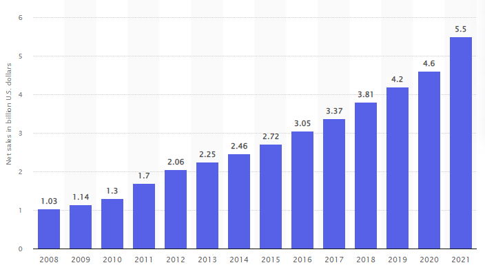 売上高純利益(紫棒)、営業利益(赤棒)はキレイな右肩上がりで伸び続けていますが、純利益(黄棒)は2021年に減少しています。